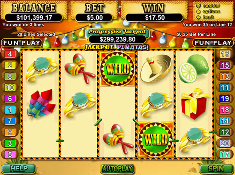 Jackpot Pinatas keeps things straightforward with its betting structure. You'll play with $0.25 coins across 20 fixed paylines, allowing bets from $5.00 per spin when playing one coin per line. The maximum bet caps at $5.00, making this an accessible option for players who prefer consistent wagering without breaking the bank.